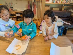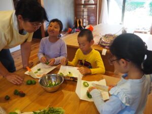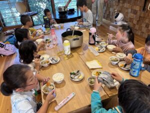 投稿日: 2025年9月30日2025年9月30日 投稿者: yuwaku里山こども園 今日は小学2年生と一緒に里山こども園をしました。里山で薪を拾い、くべて、お釜で新米を炊き、昔ながらの食生活を体験します。きーさんのお家では、収穫したサツマイモや野菜でめった汁も作りお腹いっぱい食べました。