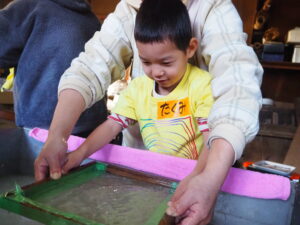 投稿日: 2025年11月13日 投稿者: yuwaku紙漉き体験、サッカー教室、みずほ保育園との交流 2歳児、4歳児、5歳児はバスに乗ってみずほ保育園へ行ってきました。年長さんは卒園証書作りをするため二俣の紙漉き体験もしてきました。みずほ保育園さんとのサッカー教室も盛り上がっていましたよ☆
