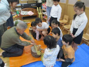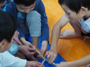 今回の里山こども園は湯涌小学校の2年生と一緒に『しめ縄飾りづくり』をしました。3人で協力しながら藁を編み、飾りをつけてステキなしめ縄飾りが出来ましたよ。来年の抱負を一人ずつ発表し来年もステキな年になることを願いました☆良い年を迎えられそうですね☆